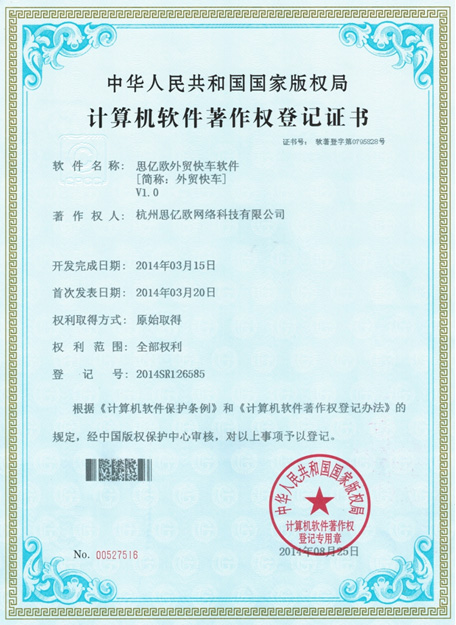 思亿欧外贸快车软件,简称外贸快车,于2014年8月25日取得由国家版权局颁发的 《计算机软件著作权登记证书》。