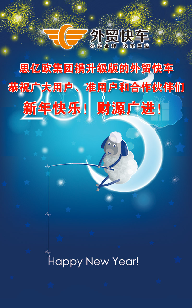 再过十几个小时,我们就要和2014说byebye和2015说hello了,在此,思亿欧集团携升级版的外贸快车,恭祝广大用户、准用户和合作伙伴们新年快乐!财源广进!