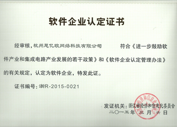 2015年3月,思亿欧取得由浙江省经济和信息化委员会颁发的《软件企业认定证书》。