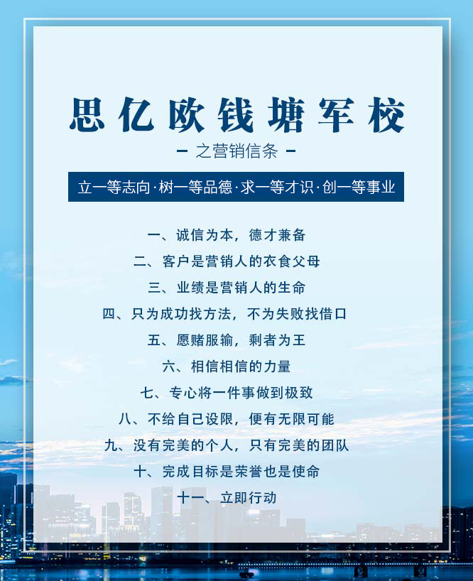 思亿欧钱塘军校将引入军事化的管理,面向思亿欧总部和全国渠道体系,为从一线营销精英,到中层管理人员,到企业高管的各级人群,提供全方位立体化的专业知识、技能;管理理论、实践;以及态度、精神和价值观的培训。有志于帮助中国各类型企业插上互联网技术应用产品和服务的翅膀飞出中国、飞向全球的思亿欧人,通过思亿欧钱塘军校的系统化培训学习,必将品学兼优,齐心创建思亿欧的全新未来。