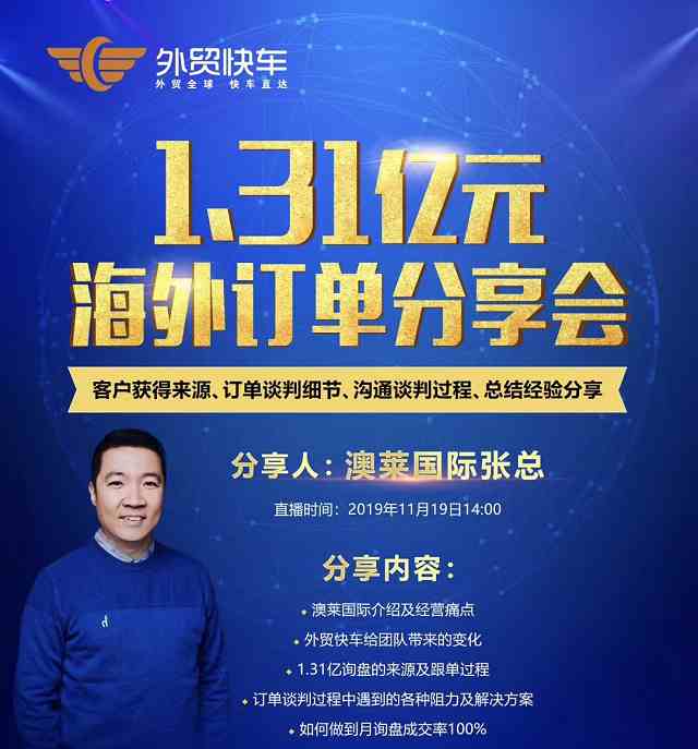 为此,外贸快车特组织此次直播分享会,荣幸的邀请到澳莱国际总经理张总亲自讲述1.31亿元订单的来龙去脉,以及如何提升外贸团队业务水平、提高询盘成交率、高效获取订单等,目的是将澳莱国际的成功经验更广泛的分享给众多外贸企业,以期未来获取更多大额订单。