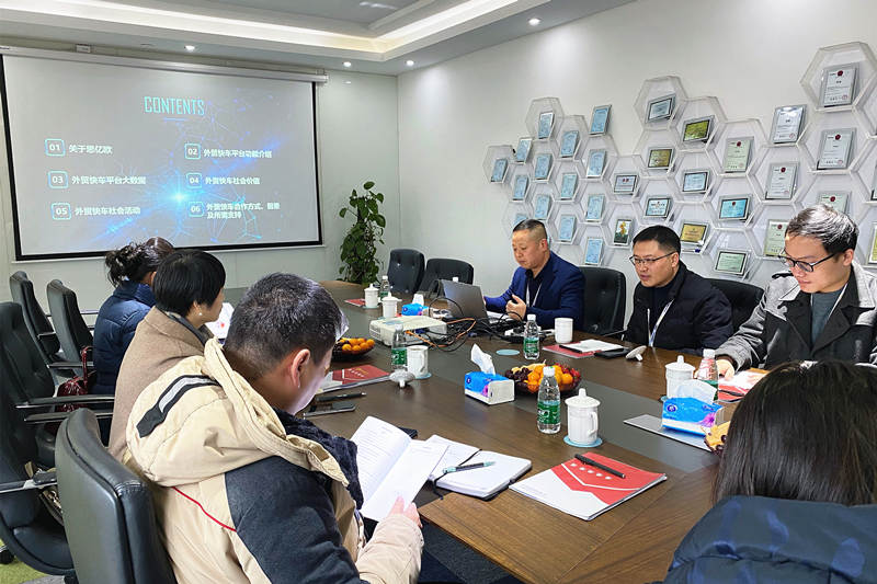 随后,公司领导协中国(杭州)跨境电子商务综合试验区建设领导小组办公室领导们,在公司会议室展开洽谈。会上何总与徐总通过多媒体呈现的方式,向来访领导详细剖析了思亿欧及外贸快车,详细介绍了思亿欧即将重磅发布的新品——思亿欧自行研发的外贸快车B端直播系统,由方总进行了现场演示。来访领导们对外贸快车新上线的直播系统产生了极大的兴趣,并多次肯定外贸快车的社会价值。