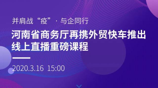 2020年,面对突如其来的新冠肺炎疫情,河南省商务厅与外贸快车再度携手,联合外贸快车河南省服务中心—郑州建桥等多家国内外知名外贸服务企业,于2020年3月16日,15:00举办 “并肩战'疫'、与企同行” 系列外贸直播培训活动。