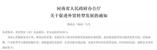 2018年12月10日,河南省政府办公厅印发了《关于促进外贸转型发展的通知》,通知特别指出:支持外贸综合服务企业发展。引进与培育相结合,加强与思亿欧、敦煌网等龙头企业战略合作,孵化培育豫满全球等本土外贸综合服务企业,打造外贸服务生态圈。