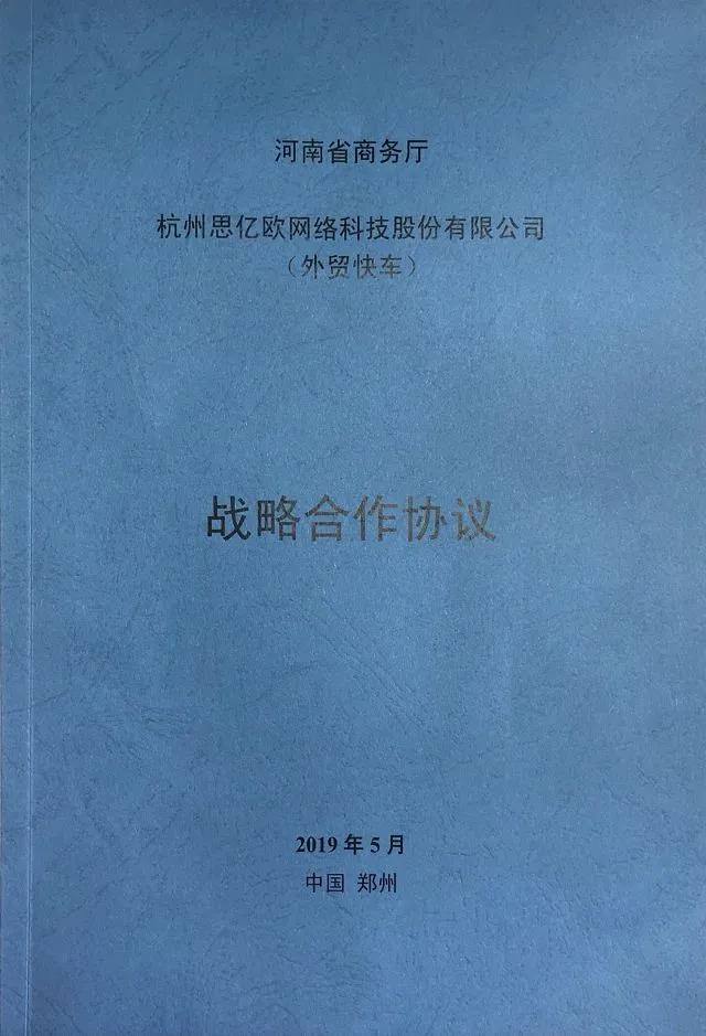 2019年5月,河南省商务厅、杭州思亿欧网络科技股份有限公司(外贸快车)于郑州签订《战略合作协议》,助力河南外贸企业开拓市场和“走出去”搭建更优质的平台,强势推动中原外贸发展。