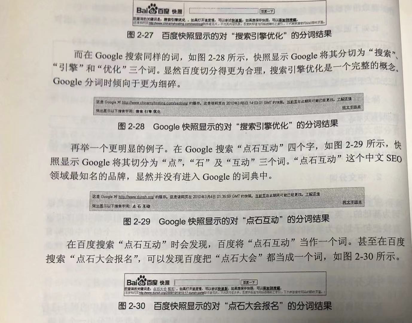 需要说明的是,快照只能在某些情况下帮助我们大致猜测搜索引擎的分词处理,但这不是一个通用可靠的方法,很多时候我们并不能从快照中看出搜索引擎是怎么分词的。比如在百度搜索一些很长的词甚至句子,对于不同网站,百度快照有时候将整个句子标为同一个颜色,有时候又分为不同颜色的词的组合。即使在快照中将整个句子标为同一个颜色,显然百度也不是将整个句子分为一个词。