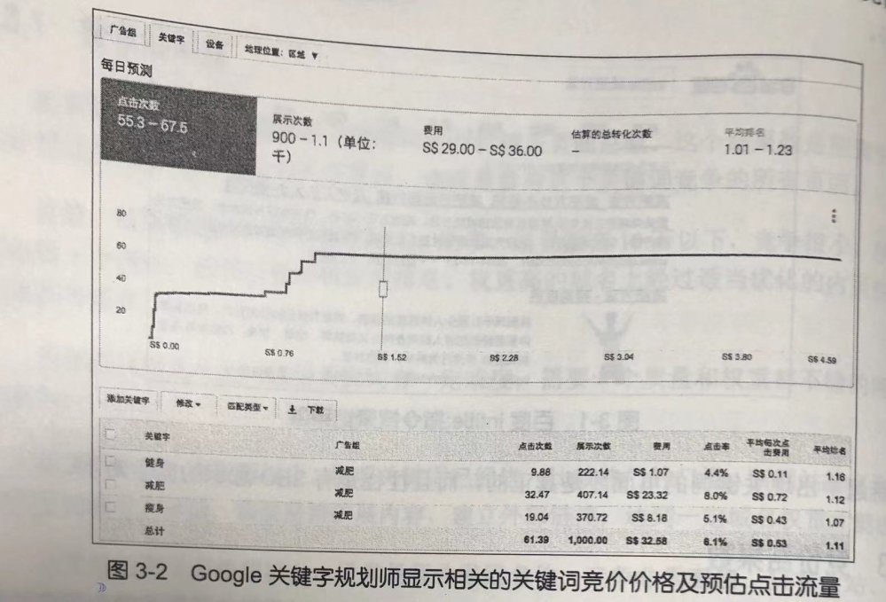 如图 3-2 所示是 Google 关键字规划师显示的与“减肥”相关的几个关键词竞价价格及预估点击流量。