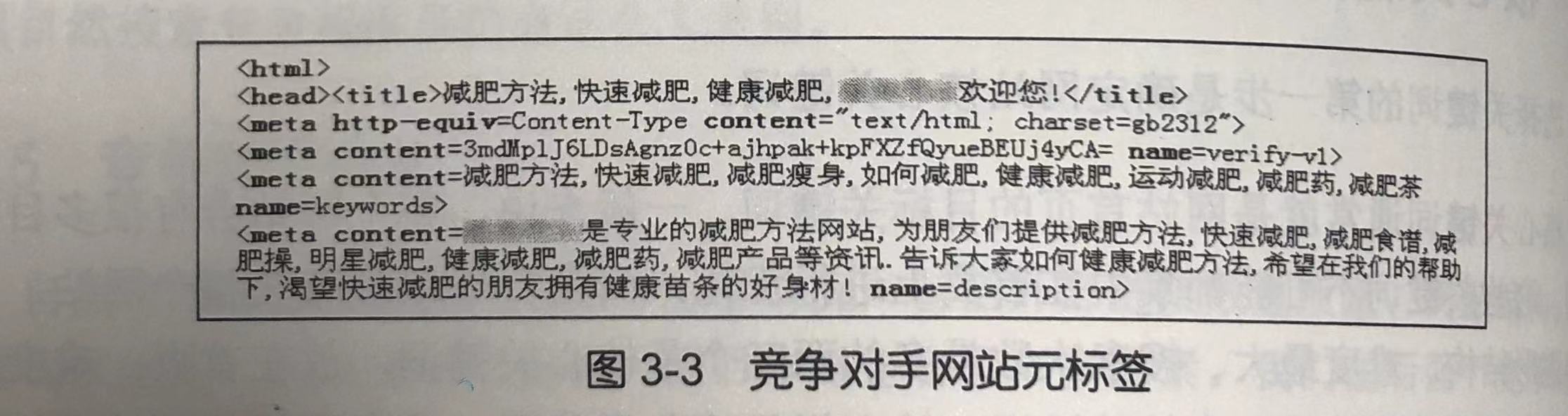 另一个备选关键词来源是竞争对手。查看竞争对手网站首页源文件,关键词标签列出了什么关键词?标题标签中又出现了什么关键词?有实力的竞争对手应该已经做了功课,他们的网站所优化的关键词很可能就是不错的选择,如图 3-3 所示。