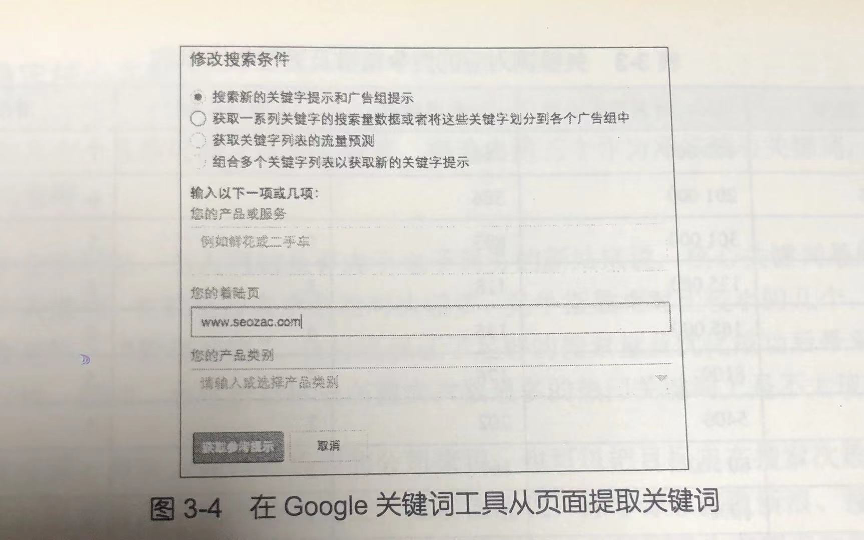 Google 关键词工具有一个功能很多人都忽略了,除了列出关键词搜索次数外,Google 工具还可以根据某个页面正文内容提炼出最相关的关键词。如图 3-4 所示,在“您的着陆页”输入竞争对手网址。