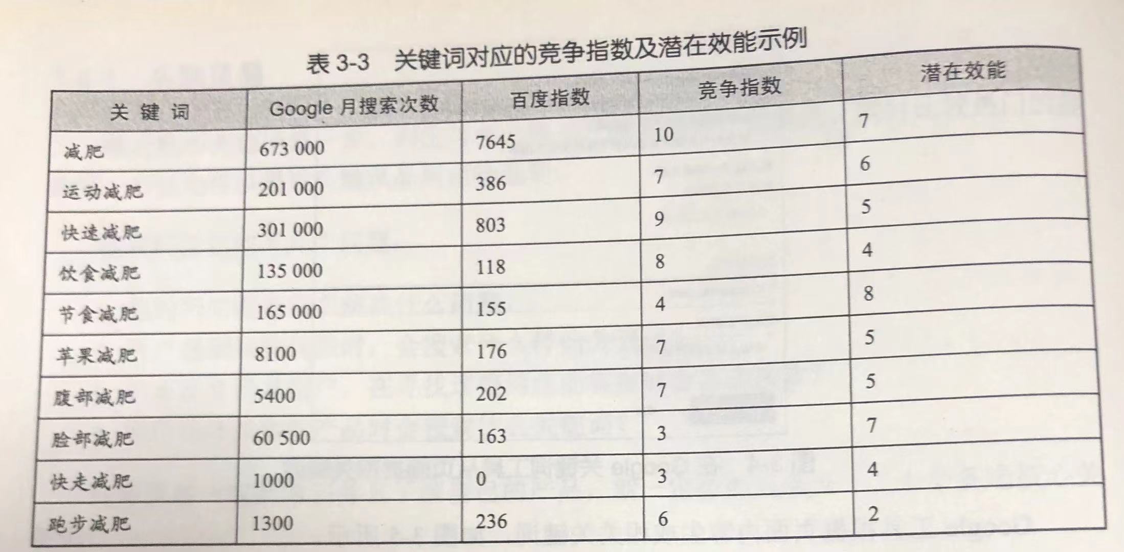 选出其中搜索次数比较多的几十个关键词,记录下 Google 搜索次数、百度指数,再列出这些关键词对应的竞争指数,如表 3-3 所示。
