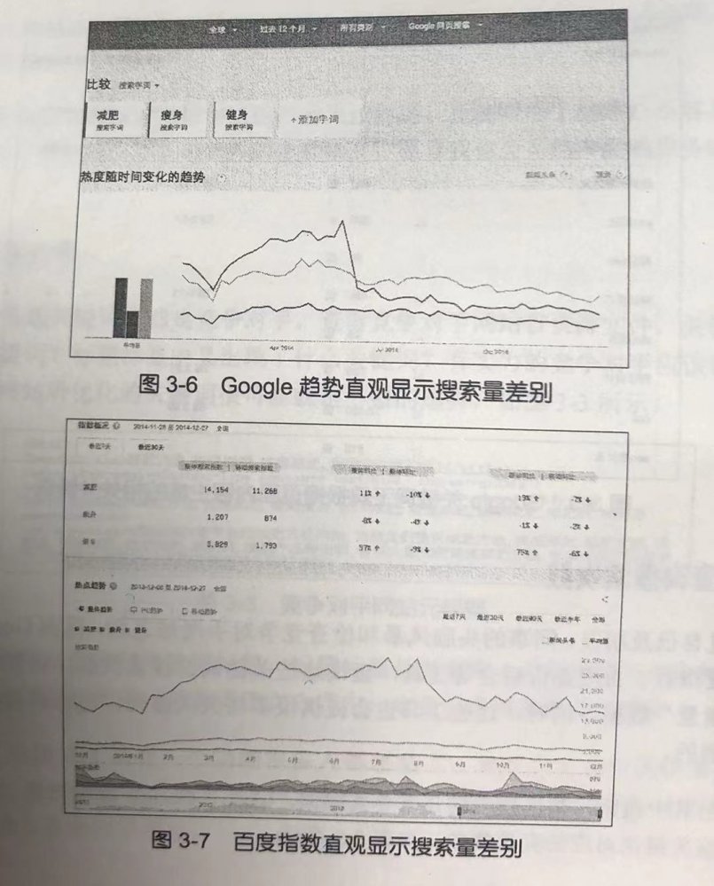 有时候需要说道看几个关键词搜索次数对比,可以在Google趋势和百度指数输入多个关键词,之间用逗号隔开,这两个工具将直观显示搜索量差别,如图3-6和图3-7所示。