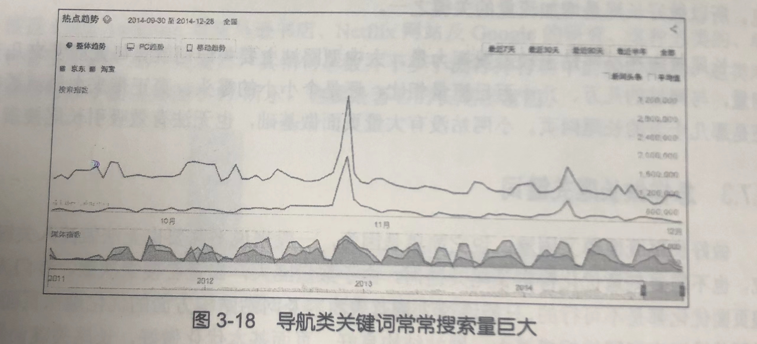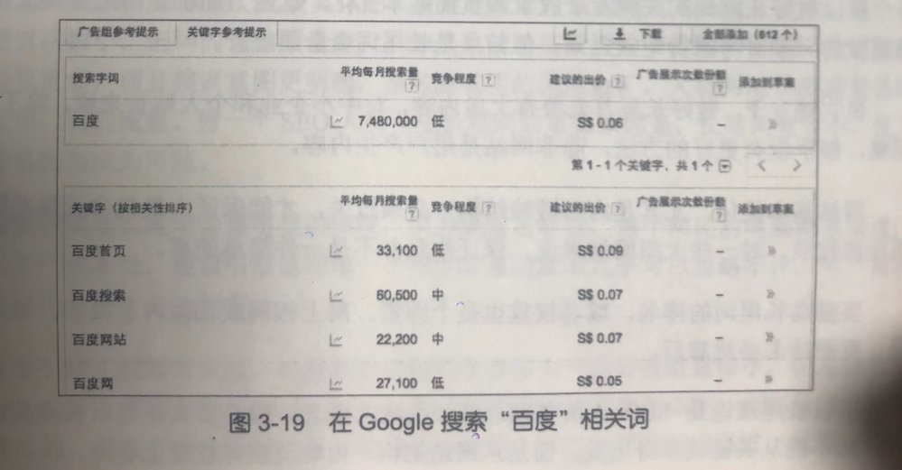 如图 3-18 所示,导航类关键词常常搜索量巨大。导航类关键词占所有搜索的大致10%,这是一个不小的比例。甚至在 Google 搜索百度(如图 3-19 所示)、在百度搜索 Google 的都大有人在。