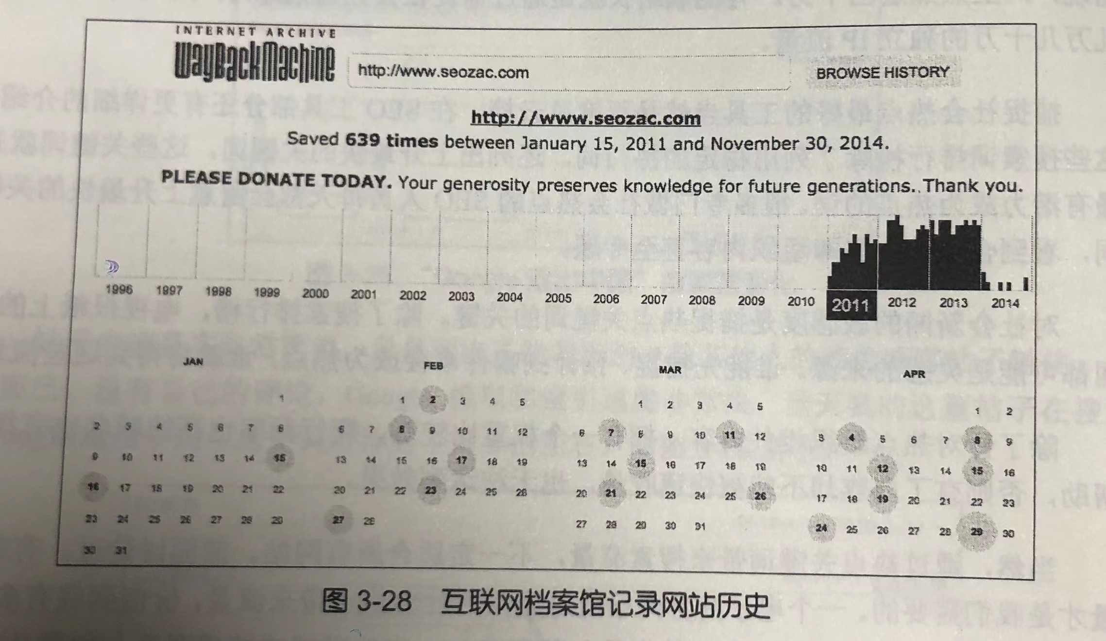 如图 3-28 所示,我的博客所在域名(seozac.com)第一次出现内容是 2011 年1月15 号,与实际情况基本符合。这个域名是 2011 年1月 13 号注册上线的,搜索引擎当天就抓取索引了,Wayback Machine 也只是隔了一天就收录了。点击每个日期链接,还可以看到当时网站页面内容。顺便说一下,我的博客“SEO 每天一贴”是 2006 年4始写的,当时是放在我另一个域名的目录下,2011 年 1 月才搬到现在的域名