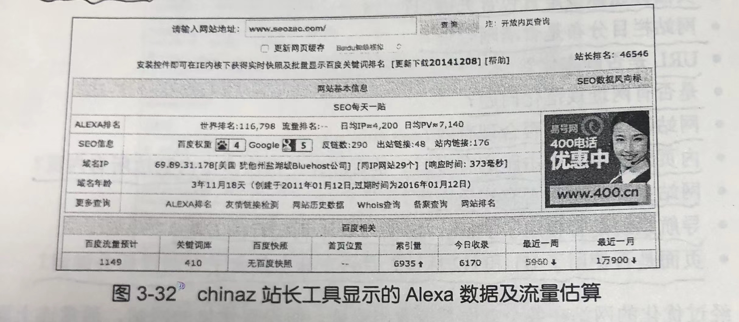 目前查询中文网站流量只能参考 Alexa 数据。Alexa 显示的是网站排名,不是流量,但只要有已知真实流量的网站(比如自己的网站),通过比例可以推算其他网站流量。虽然 Alexa 的数据经常不靠谐,但暂时也没有替代方法。而且 SEO 不用自己查 Alexa排名然后换算,chinaz.com、爱站等都提供了一站式查询工具,如图3-32 所示是chinaz的数据