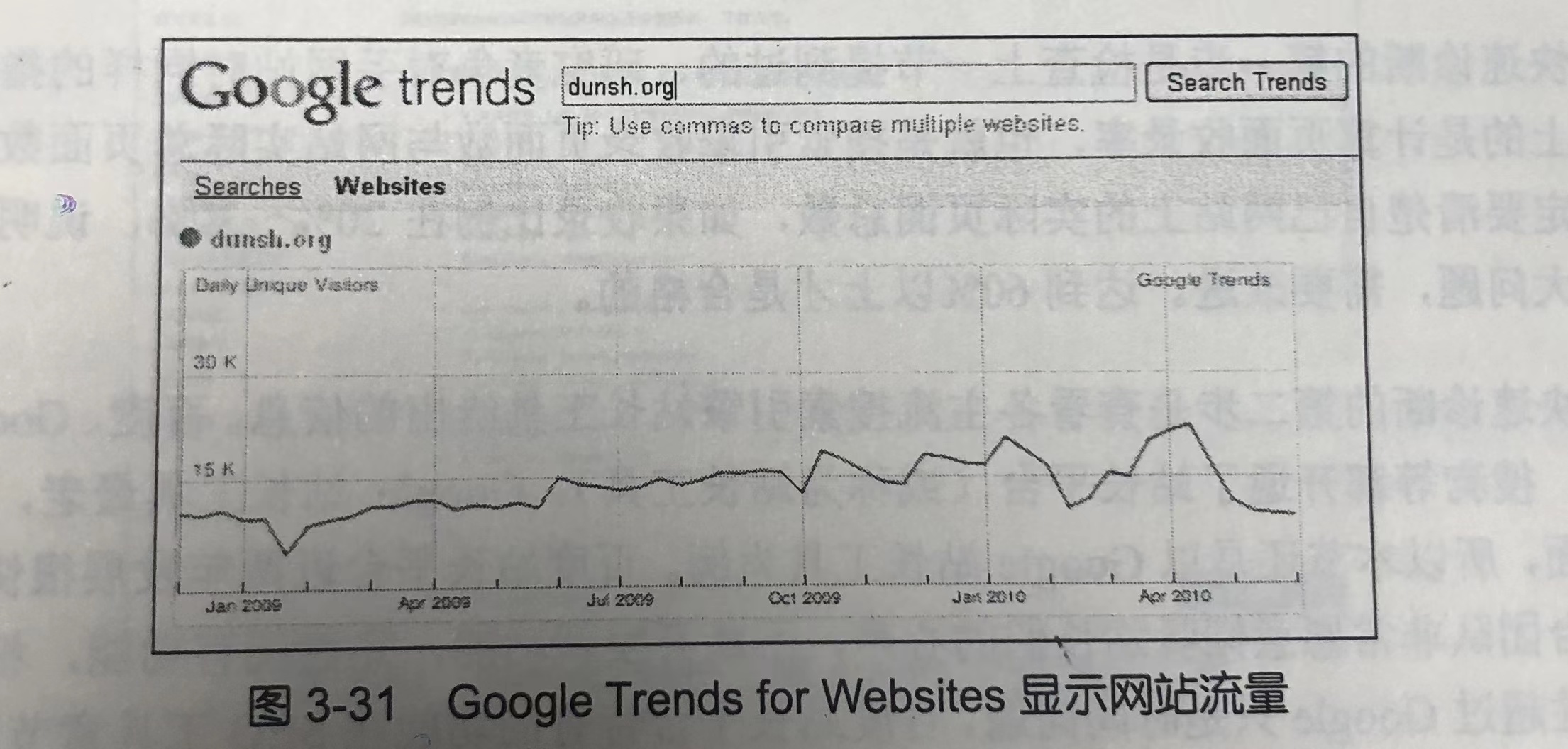 Google 趋势曾经有一个称为 Google Trends for Websites 的功能,可以比较准确地查询竞争对手网站大致流量,其流量数据不仅仅来自于流量分析工具 Google Analytics,还有 Google 工具条、关键词排名点击率、网络服务商 ISP 等来源,如图 3-31 所示。