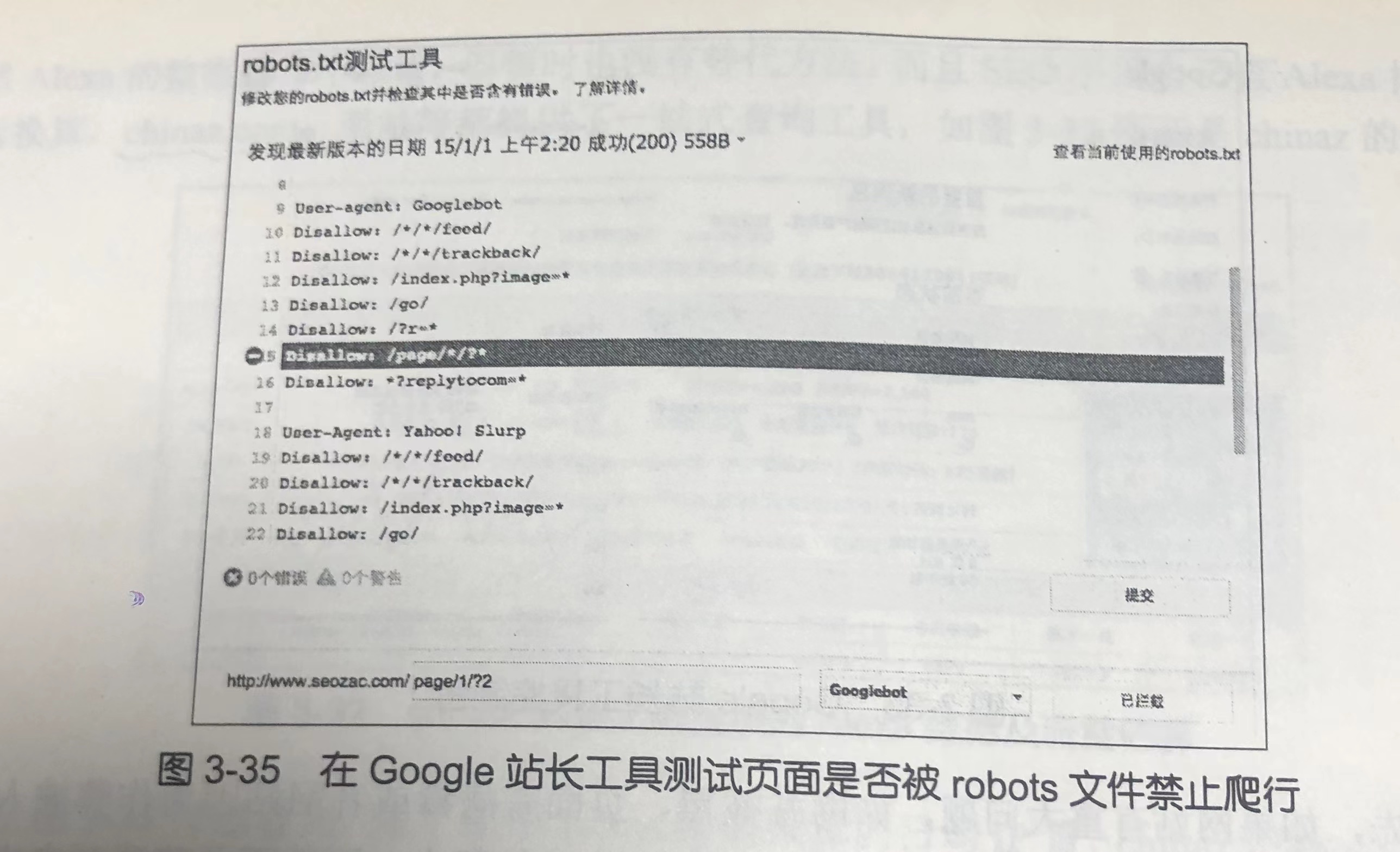 站长可以在这里测试 robots 文件指令是否正确,输入一个网址,点击“测试”按钮看输入的网址是否可以被抓取或是被禁止,以及被哪一行指令禁止,如图 3-35 所示。