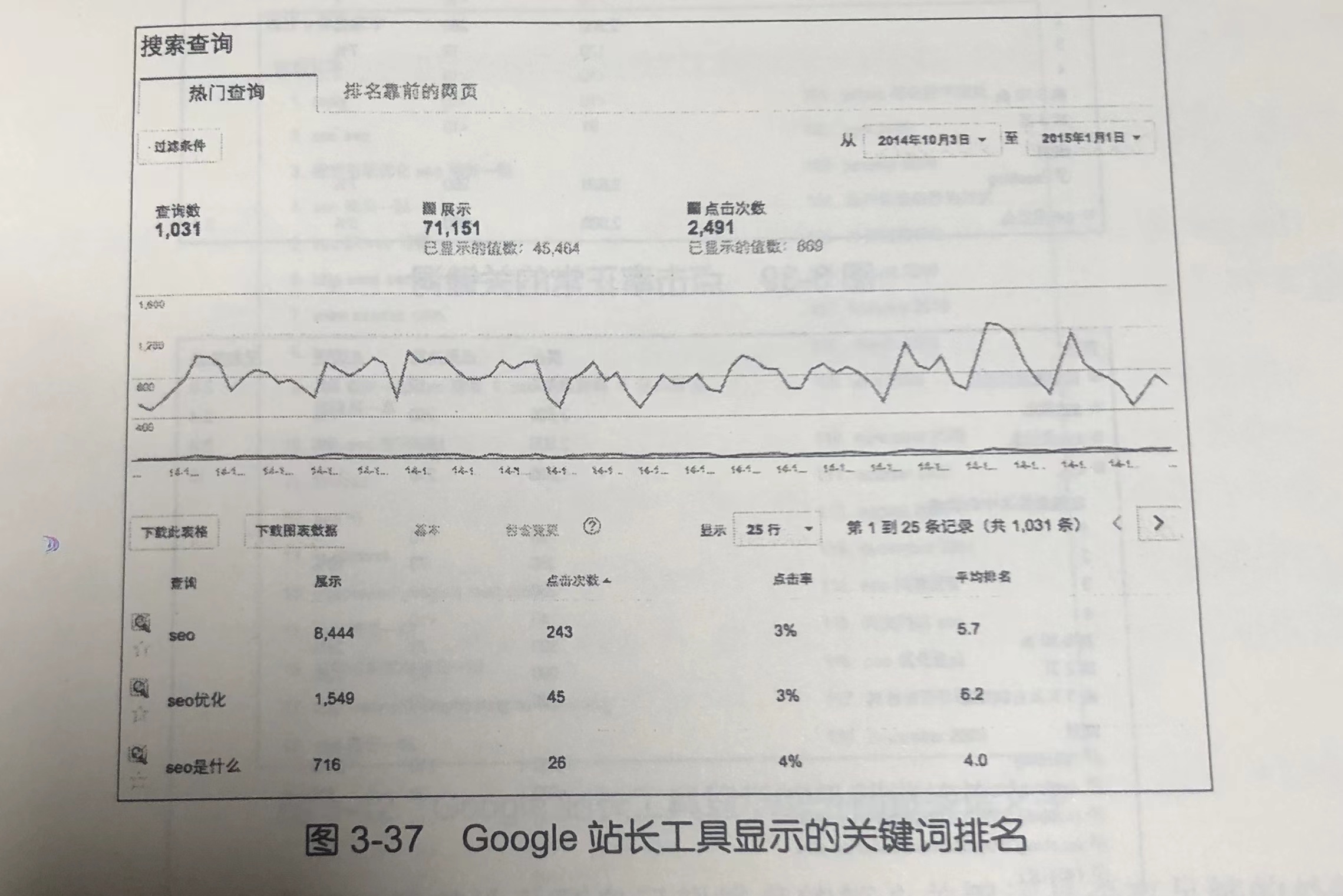 在搜索查询部分,站长工具列出网站获得排名的关键词有哪些,并且列出了搜索结果显示次数、点击次数、点击率和平均排名,如图 3-37 所示。