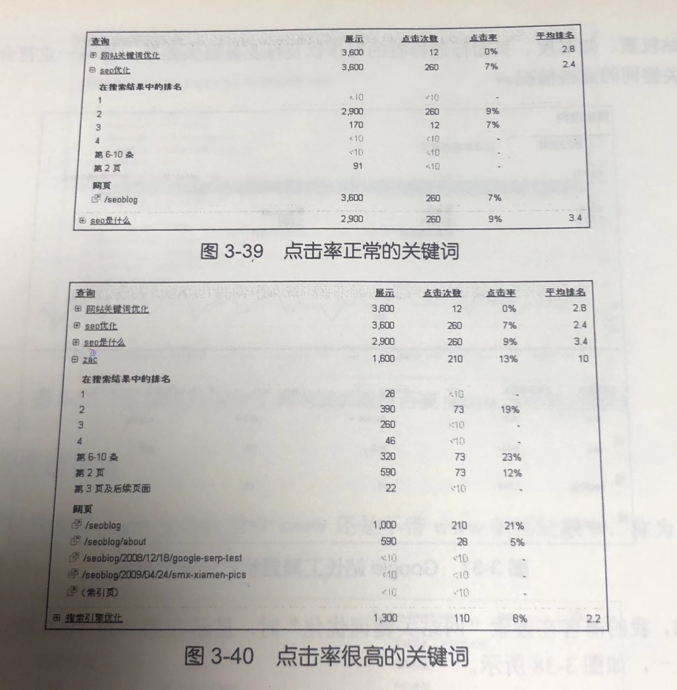 另外一个关键词“SEO 优化”,排在第二位时点击率是 9%,排在第三位时为7%大致正常,如图 3-39 所示。