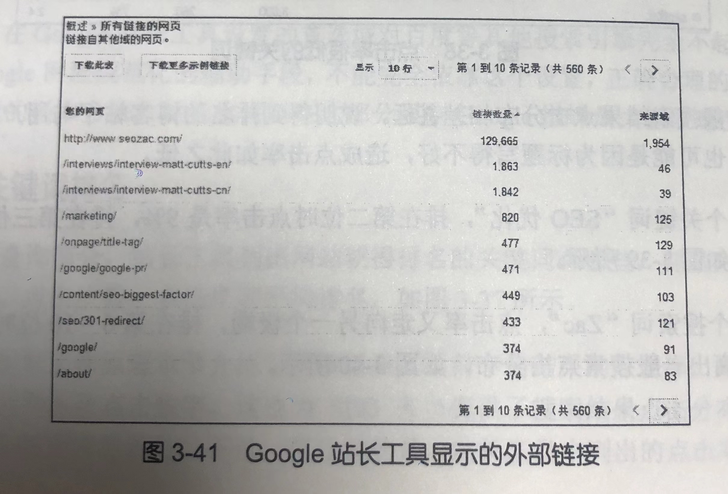 Google 的 link:指令非常不准确,基本不能用来查看外部链接。站长工具中列出的外部链接则要准确得多,SEO 人员可以一目了然地看到自己网站上哪些页面最受欢迎吸引到最多的外部链接,如图 3-41 所示。