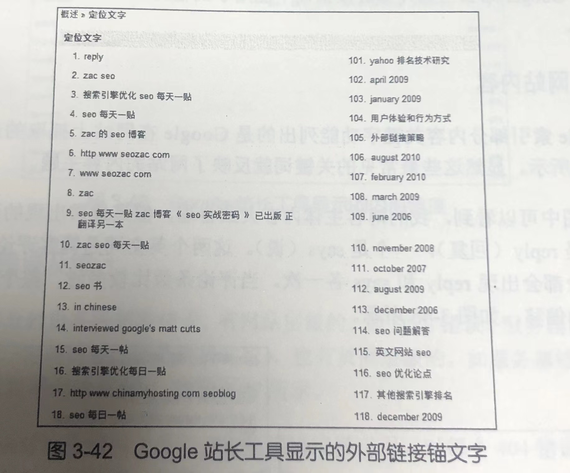Google 站长工具还列出了外部链接使用的锚文字,站长工具里称为“定位文字”,如图 3-42 所示。