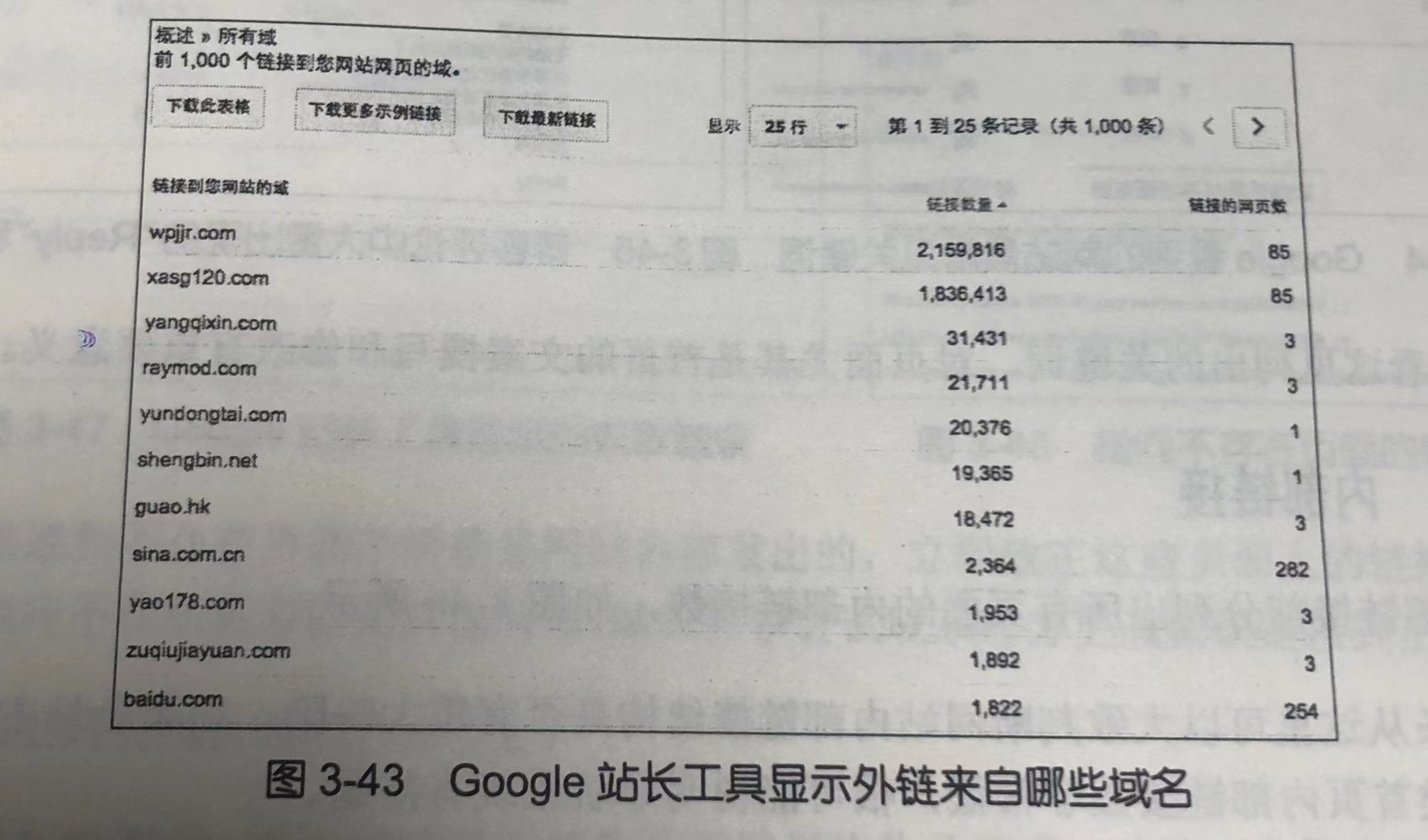 Google 站长工具也显示出外链来自哪些域名,给了多少外链,如图 3-43 所示。站长可以点击域名链接,继续挖掘出链接来自哪些 URL,又指向哪个 URL。