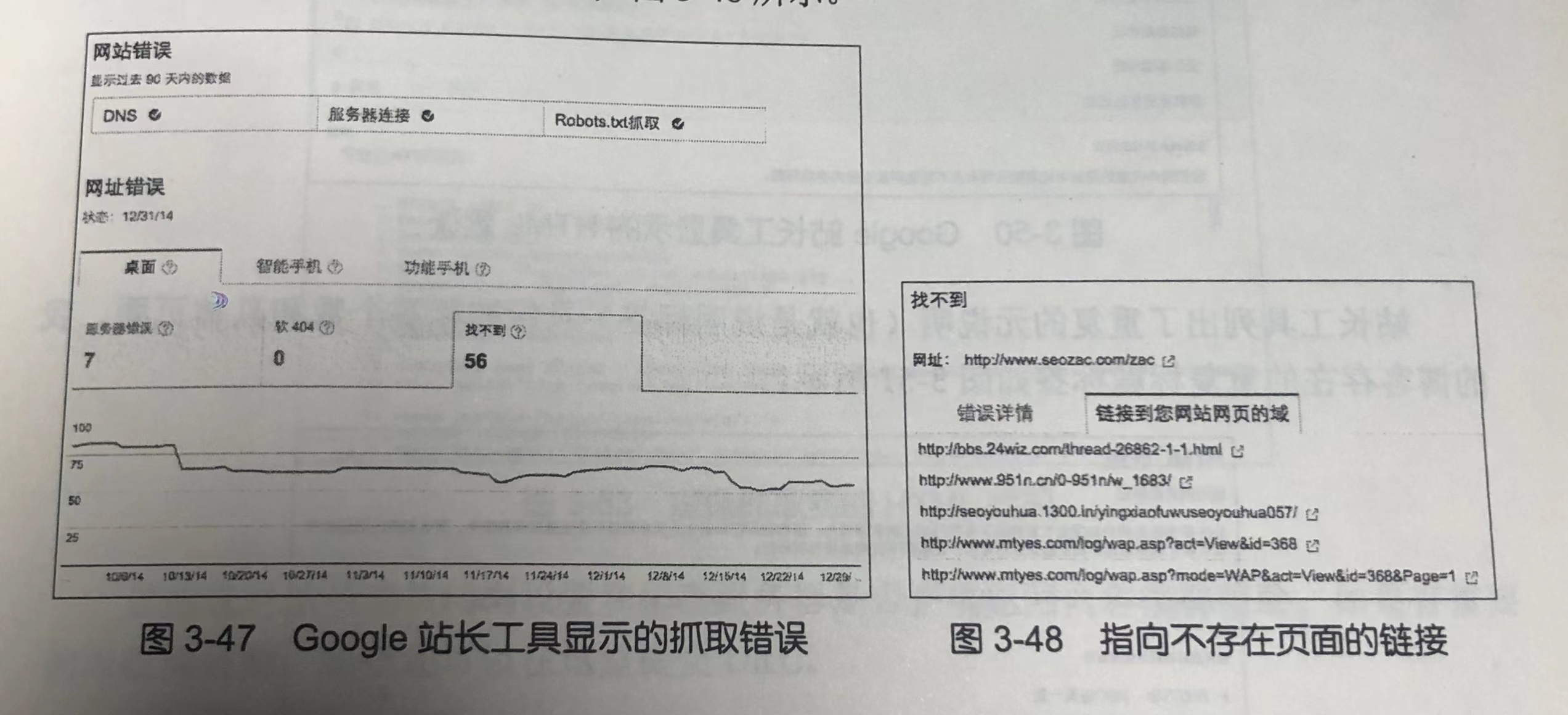 抓取错误部分列出各种抓取错误,有网站层级的,如 DNS 错误、服务器问题、robots文件禁止(这不一定是错误,只是提醒站长),也有页面层级的,如服务器错误代码、软404、404错误(找不到的页面),如图 3-47 所示。