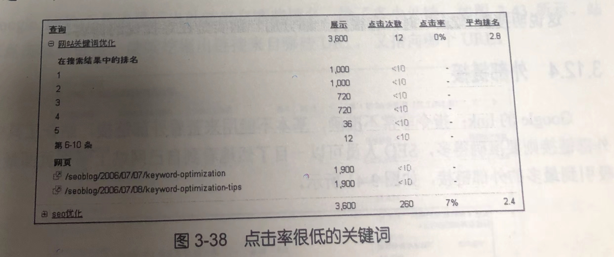 比如,我的博客在搜索“网站关键词优化”时,显示在第一位1000次,点击率还不到百分之一,如图3-38所示。