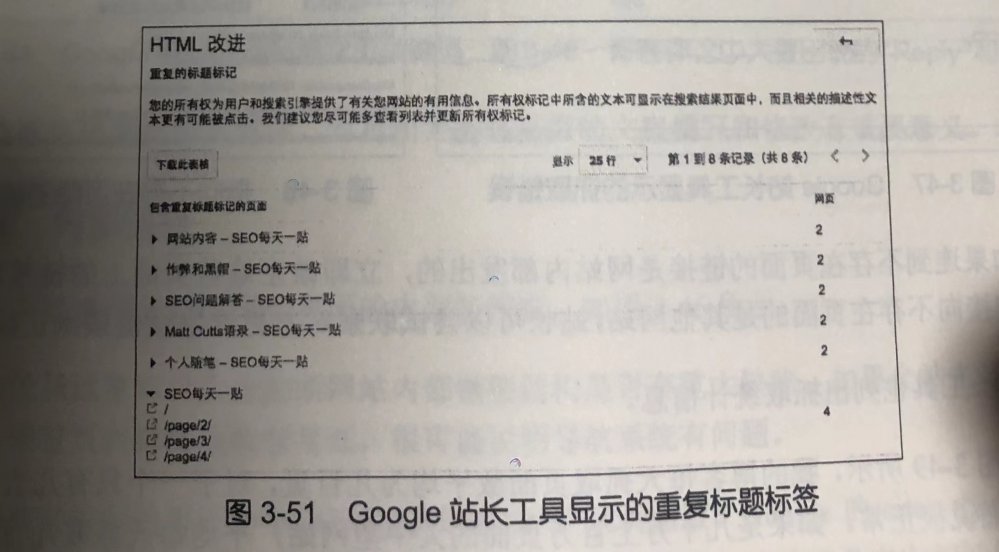 站长工具列出了重复的元说明(也就是说明标签)及标题标签个数和具体页面。我的博客存在的重复标题标签如图 3-51 所示