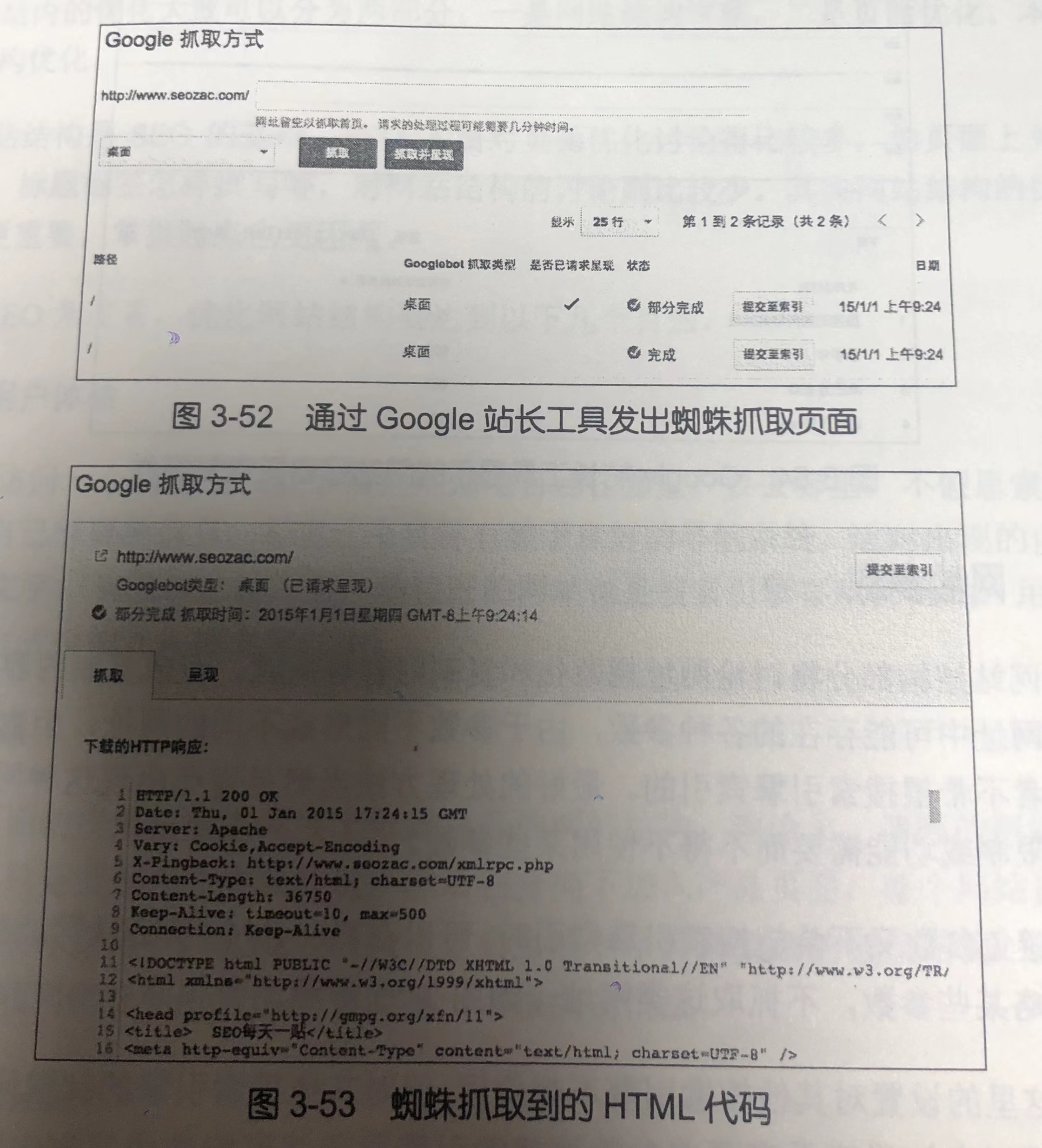 在 Google 抓取方式部分,站长可以输入自己网站上的任何一个网址,站长工具会发出 Google 蜘蛛,实时抓取页面内容,并显示出抓取的 HTML 代码,包括服务器头信息和页面代码,如图 3-52、图 3-53 所示。如果点击的是“抓取并呈现”,Google 会像浏览器一样尝试渲染页面并显示结果,站长可以直观发现哪些 JS 不能被执行和渲染。