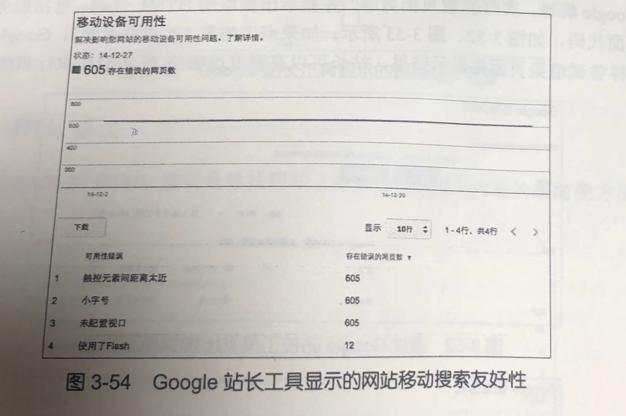 移动搜索近两年发展迅速,2014 年年底百度移动流量已经超过 PC 端,因此网站的移动搜索友好性是 SEO 必须关注的重要内容。Google 站长工具移动设备可用性部分列 出了网站在移动搜索方面的问题,如图3-54所示。我的博客没有设置移动版,也没有使用自适应布局,因此字号、布局等方面都需要改进。