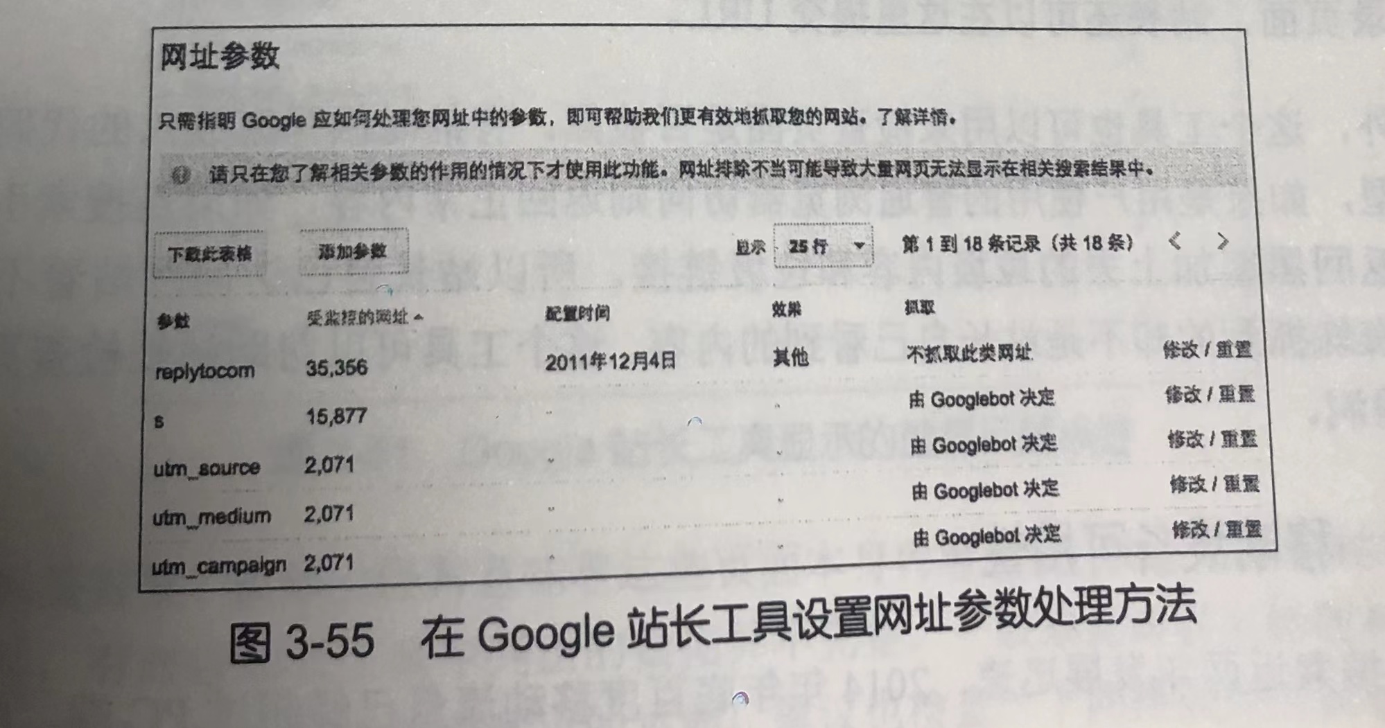 不能避免参数又不希望搜索引擎索引时,可以在 Google 站长工具网址参数 部分通知Google 忽略某些参数,不抓取这类网址,如图 3-55 所示。
