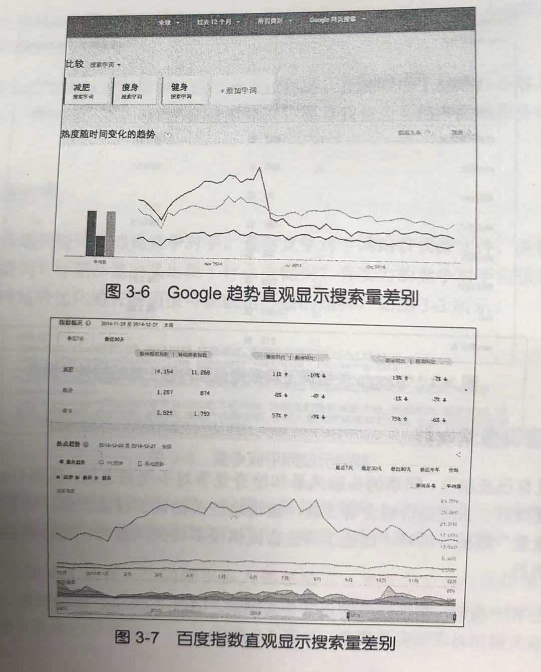 有时候需要说道看几个关键词搜索次数对比,可以在Google趋势和百度指数输入多个关键词,之间用逗号隔开,这两个工具将直观显示搜索量差别,如图3-6和图3-7所示。